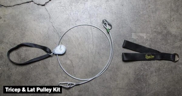 Triceps & Lat Pulley Set: (1) Cable: 75″ long, 0.25″ diameter, (1) 18″ Loading Strap Pin, (1) Short Triceps/Ab Strap, (1) 2.5” Swivel-Eye Pulley, (2) 0.375″ Spring Clips.