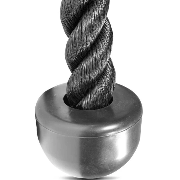 This pulldown exercise rope features a high-quality nylon construction with shiny black finish, textured grip surfaces, and a hanger in the middle for attaching to the hook/carabiner on your pulldown machine.