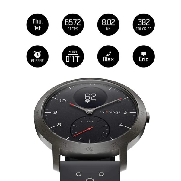Steel HR Sport is a hybrid smartwatch specifically designed for your workout, featuring heart rate monitoring, multi-sport tracking, connected GPS and a Fitness Level assessment via V02 Max estimation. All of these advanced features are housed in a classic timepiece that goes the distance with water resistance up to 50m, a long-life battery of up to 25 days, and a durable stainless steel case.