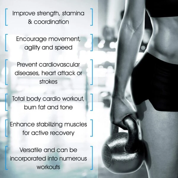 Product benefits: Kettlebells are effective for total body cardio workout, fat burninng, and muscle toning and active recovery. They work great to build up and increase your strength, stability and power. Daily training with kettlebells can help improve movement, agility and speed too. You name it. There are many health benefits you can get from exercising with these little ketlebells.